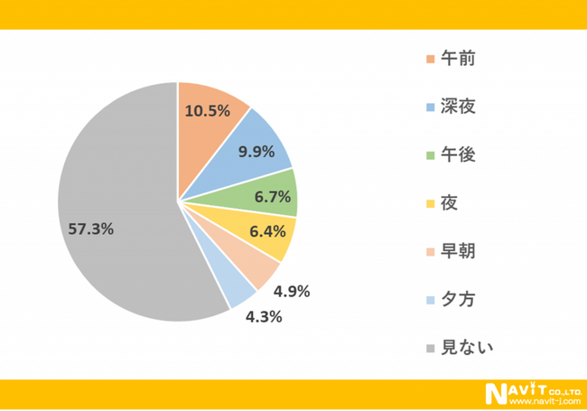 テレビショッピング番組を見る時間帯については、「午前」が10.5%、「深夜」が9.9%、「午後」が6.7%という順になりました。
