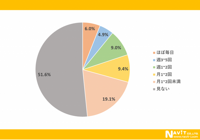 テレビショッピング番組を見る頻度については、見ないを除くと「月1~2回未満」が19.1%、「月1~2回」9.4%、「週1~2回」が9.0%という結果となりました。ほぼ毎日見る人もいれば、全く見ない人まで様々のようですね。