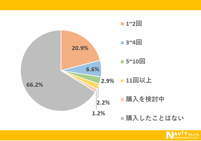 「今まで何回ほどテレビショッピングで購入したことがありますか?」という質問については、「1~2回」が20.9%、「3~4回」が6.6%、「5~10回」が2.9%という順になりました。