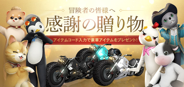 12/22(水)メンテナンス後から、豪華アイテムが沢山詰まった「年末感謝箱」を獲得できるアイテムコードが公開されます。初登場の乗り物「ガイツローダー」やガンスリンガーまで着用できる「動物アバター」など、盛り沢山のアイテムがアイテムコード入力で獲得できるので是非、忘れずお受け取りください。