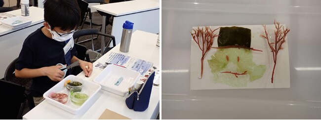 続いて、海藻により親しみを持ってもらえるよう、海藻おしば作りを行いました。海藻おしば作りでは、名刺サイズのカードの上に自由に海藻をのせて作品を作りました。はさみを使って海藻を好きな形にカットしたり、つまようじを使って細かな作業をしたり、海藻とたくさん触れ合いながら、皆さん個性豊かな作品を作ることができました。作品は乾燥機で乾燥させ、ラミネートさせて完成しました。
