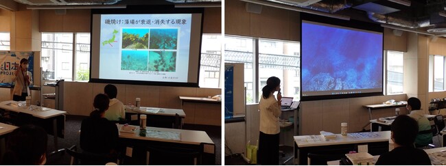 最後に、近年話題となっている問題、海藻の集まりである藻場が衰退・消失してしまう「磯焼け」現象と、その海洋環境への影響についてお話ししました。その後、磯焼けしている様子とそうでない様子の動画を見て、違いを確かめました。講座では株式会社岡部の藻場再生に取り組む事業についても紹介しました。藻場は海の生き物や環境にとって大事な役割をしていることを知ることができました。