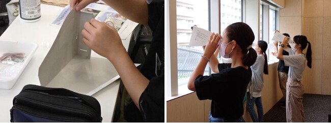 次に、葉や海藻に含まれる色素が光の一部を吸収することを簡易分光器を使った観測を通して体験しました。簡易分光器とは、スリットから取り込んだ光を特殊なシートを通して見ると、目に見える光である可視光を虹のように色を分けて見ることができる装置です。受講生はまず簡易分光器を組み立てて、虹のように光がわかれる様子を見ました。さらに葉や海藻そのもの、さらにこれらから抽出した色素を通った光の色を見ました。色素を通すと、虹色の光から青や紫、赤の一部の色が見えなくなり、葉や海藻に含まれる色素が光を吸収することを確認できました。