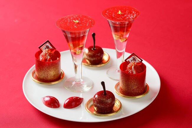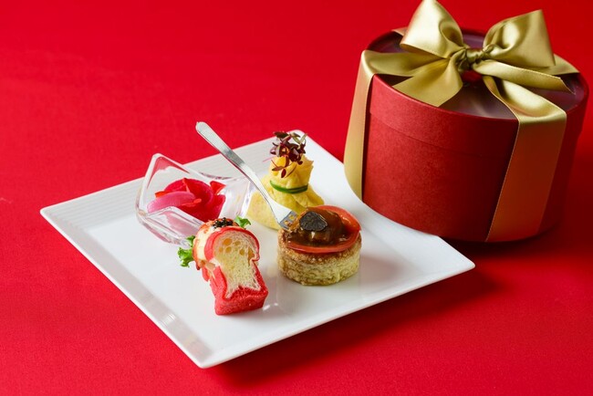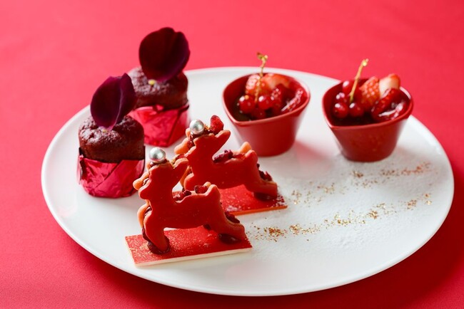 クリスマスシーズンを華やかに彩る“RED”をキーカラーにしたアフタヌーンティー。艶めくレッドがまぶしい中に金箔をアクセントにあしらい華やかに仕立てたスイーツ7品が並びます。セイボリーは、リボンのついたギフトボックスに見立てた姿でお目見え。赤ワインとトリュフの風味を効かせた“東京ビーフ”のブレゼや赤く縁どられたパンがかわいらしいオマール海老のサンドイッチなど4品をご用意しました。お食事の最後にはたっぷりとベリーを使用したファイナルデセールを。3種のフレッシュなベリーにバラ香るシャーベットを合わせ、仕上げにベリーの味わいがぎゅっと詰まったルージュソースをかけて仕上げます。マリオットレッドで彩られた美食とともに、ゆったりと上質な午後のひとときをどうぞ。