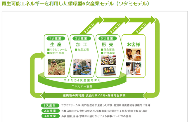 ワタミファームで採れた有機野菜(1次産業)は、ワタミ手づくり厨房で加工(2次産業)され、ワタミグループの外食事業や宅食事業(3次産業)を通じて、全国のお客様に提供されます。