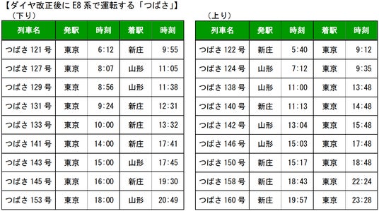 2025年3月のダイヤ改正までに9編成を投入し、2026年春までに全ての「つばさ」をE8系に統一します。