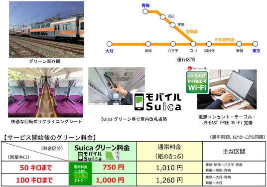 ご乗車には、「グリーン券」が必要となりますので、ご乗車前にお買い求めください。なお、グリーン券は、おトクな「Suicaグリーン料金」が適用され、駅の券売機にお並びいただくことなくお手持ちのスマートフォンで購入可能なモバイルSuicaでのご利用が便利です。中央線快速・青梅線のグリーン券・グリーン定期券は、2025年3月15日(土)より発売を開始します。