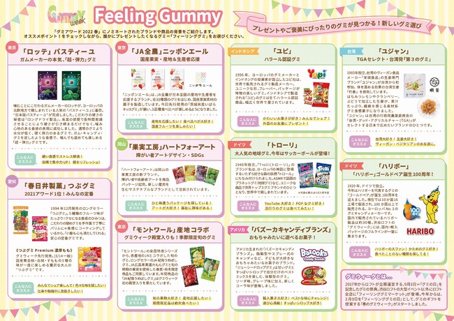 人気投票で「グミアワード」を決定。また会場では春の新商品をはじめ、ゼラチン不使用「第3のグミ」や「アジアングミ」、日本の産地を応援する「サステナブルグミ」、YouTubeで大人気のグミなど約160種類を販売します。