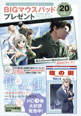 最新HC第3巻の発売を記念して、「『塩の街 -自衛隊三部作シリーズ-』HC3巻&LaLaDX5月号連動BIGマウスパッドプレゼント」を実施します。縦350mm×横600mmの超BIGサイズです! HC3巻帯と『LaLaDX』5月号についている応募券、計2枚で応募可能。応募方法などの詳細はHC3巻帯もしくは『LaLaDX』5月号誌面を必ずご確認ください。