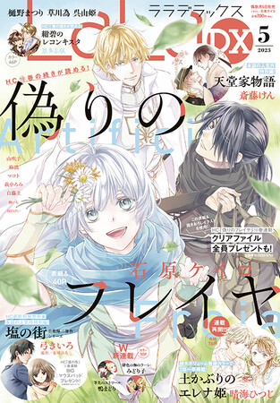 《株式会社白泉社》(本社:東京都千代田区、代表取締役社長:菅原弘文)は、『LaLaDX』2023年5月号を4月5日(水)に発売いたします。大人気転生農業ファンタジー「土かぶりのエレナ姫」(晴海ひつじ)が待望の連載再開! 豪華2本立てで登場します。表紙を飾るのは、最新HC10巻が同日発売となる「偽りのフレイヤ」(石原ケイコ)です。応募者全員プレゼント&白泉社公式WEBくじ「漫福ガチャ」の実施もありますのでお楽しみに! 本誌連載陣より、「天堂家物語」(斎藤けん)&「塩の街 -自衛隊三部作シリーズ-」(漫画:弓きいろ 原作:有川ひろ<角川文庫/KADOKAWA刊>)がWゲストとして登場です。期待のW新連載「筆先のエトワール」(鴨まどり)&「緋色の枷のラーレ」(みどり子)にも注目です。待望のHC第1巻が4月5日(水)発売となる「紺碧のレコンキスタ」(恩多志弦)はカラーつきです。