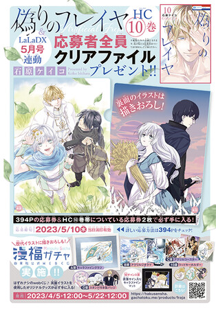 最新HC10巻発売を記念して、「『偽りのフレイヤ』HC10巻&LaLaDX5月号連動応募者全員クリアファイルプレゼント」を実施します。HC10巻帯と『LaLaDX』5月号についている応募券、計2枚で応募可能! クリアファイルの裏面は石原ケイコ先生の描きおろしイラストなります。10巻を記念した特別なクリアファイルをぜひ手に入れてください。