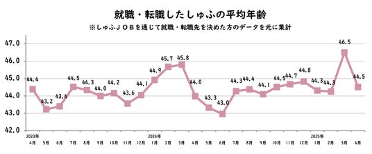 転職しゅふの平均年齢は、前月比-2.0歳、前年同月比+0.5歳の44.5歳となりました。