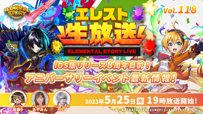 Studio Z株式会社(本社:東京都港区 代表取締役CEO:池幡 賢)が運営しております 共闘対戦 爽快パズル消しゲー『エレメンタルストーリー』は、2023年5月25日(木)19:00より、Studio Z公式エレスト生放送vol.118を配信いたします。8周年を記念したイベントやキャンペーンの最新情報、全国各地を回るリアルイベント情報のお届けや、放送記念プレゼント、生放送限定グランバトルの実施を予定しております。