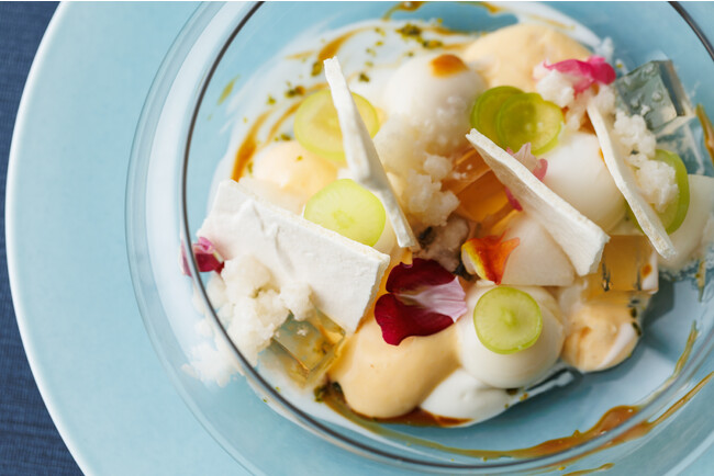 ラ・フランスはそれぞれコンポート、ムース、エスプーマに加工し、甘酒のグラニテ、梅酒のジュレと組み合わせました。口に運んだ際の、ラ・フランスのフルーティーな香りと米の甘味、梅酒の穏やかなアルコール感が混じり合い、豊穣の秋をイメージした風味抜群のパフェに仕上げました。ラ・フランスの豊かな香りを存分に感じられるよう、広口の器にてご提供いたします。