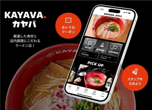 このたび、米国での出店拡大を見据え、厳選した食材と店内調理にこだわる新業態のラーメン店「KAYAVA.総本店」を東京・茅場町にオープンいたします。これにあわせて、公式アプリをリリース致します。来店して注文するとスタンプを貯めることができ、次回以降に使えるお得なクーポンと交換できます。また、「KAYAVA.」の魅力を紹介するブランドストーリーコーナーもご用意しています。ぜひアプリをダウンロードのうえ、お店にもお越しいただき、スタンプや特典をお楽しみください。
