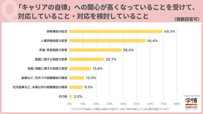 「キャリアの自律」への関心が高くなっていることを受けて、対応していること・対応を検討していることは、「研修機会の拡充」が69.3%で最多。次いで「人事評価制度の変更」56.4%、「昇進・昇格制度の変更」38.6%が続きました。「希望するキャリアに応じて、参加する研修を自身で選択できるようにしている」「人事異動の際に、これまで以上に本人の希望やキャリア意向を考慮している」「若手を管理職に登用するなど、能力開発を支援している」「年功序列ではなく、成果や能力に応じた昇進昇格を増やしている」といった声が上がりました。