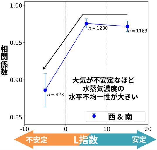 さらに、千葉市に設置された4方位観測システム(4AZ-MAXDOAS)(注5)により、水蒸気濃度の水平方向の不均一性を捉えることに成功しました。高度0-1 kmの4方向のデータを解析したところ、大気が安定しているときには各方位間の相関係数が0.95を超えていたのに対し、不安定な大気状態では0.95を下回り、一部では0.90を下回ることも確認され、大気不安定時に水蒸気の不均一性が顕著となる傾向が明らかになりました(図3)。