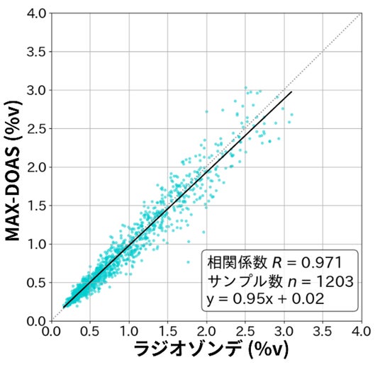 まず、つくばにおいてラジオゾンデの観測値と比較した結果、A-SKY/MAX-DOASで得られた水蒸気濃度は相関係数(注4)0.971(サンプル数1203)と大部分が一致し、本手法の信頼性が確認されました(図2)。