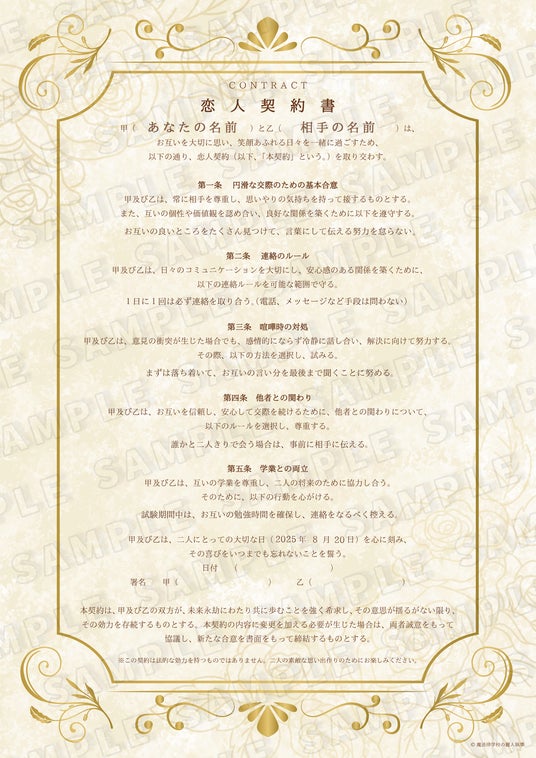 作中に登場する主要なキーワード「契約」にちなみ、自分や相手の名前、契約条件などを自由に入力することで、世界に一つだけの「恋人契約書」を作成できるメーカーを特設サイト上に設置。