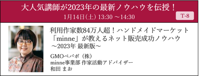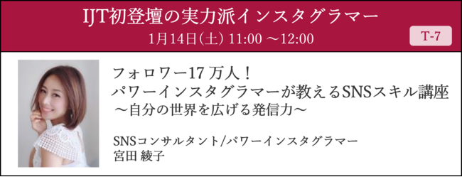 会場内ではセミナーを併催する(全8本)。コメ兵やGINZA SIXから学ぶ最新の業界事情および売上UPにつながる手法や、ラッキー商会、Google合同会社、Shopify Japan(株)による越境ECのセミナー等、豪華なラインナップで開催する。またフォロワー17万人のパワーインスタグラマ―宮田 綾子氏のIJT初登壇が決定しているが、SNS運用に悩んでいる小売店やハンドメイド作家から既に申込が多数入っている。セミナーは満席となり次第受付終了のため、早めの申込みを推奨する。