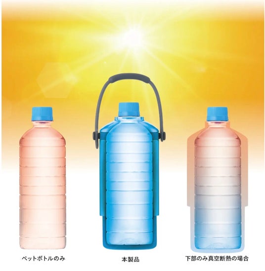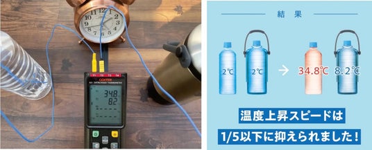 水温2℃のペットボトルを外気温21℃の直射日光が当たる場所で60分設置した保冷力実験では、本アイテムを使用しなかったペットボトルは34.8℃まで上昇したのに対し、本アイテムを使用したペットボトルは8.2℃で冷たさをキープ。温度上昇スピードを1/5以下に抑えた結果となった。