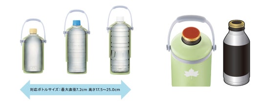 最大直径7.2cm、高さ17.5cm~20.5cmと幅広いサイズに対応。ボトル容量は約300ml~670mlが目安。氷点下パック・コンパクト(別売)と組み合わせて使用する場合、高さ14.5cm、約300mlのショートボトルにも対応。飲み口の広いボトル缶にも対応しているため、寒い季節のホットドリンクの保温にも最適。
