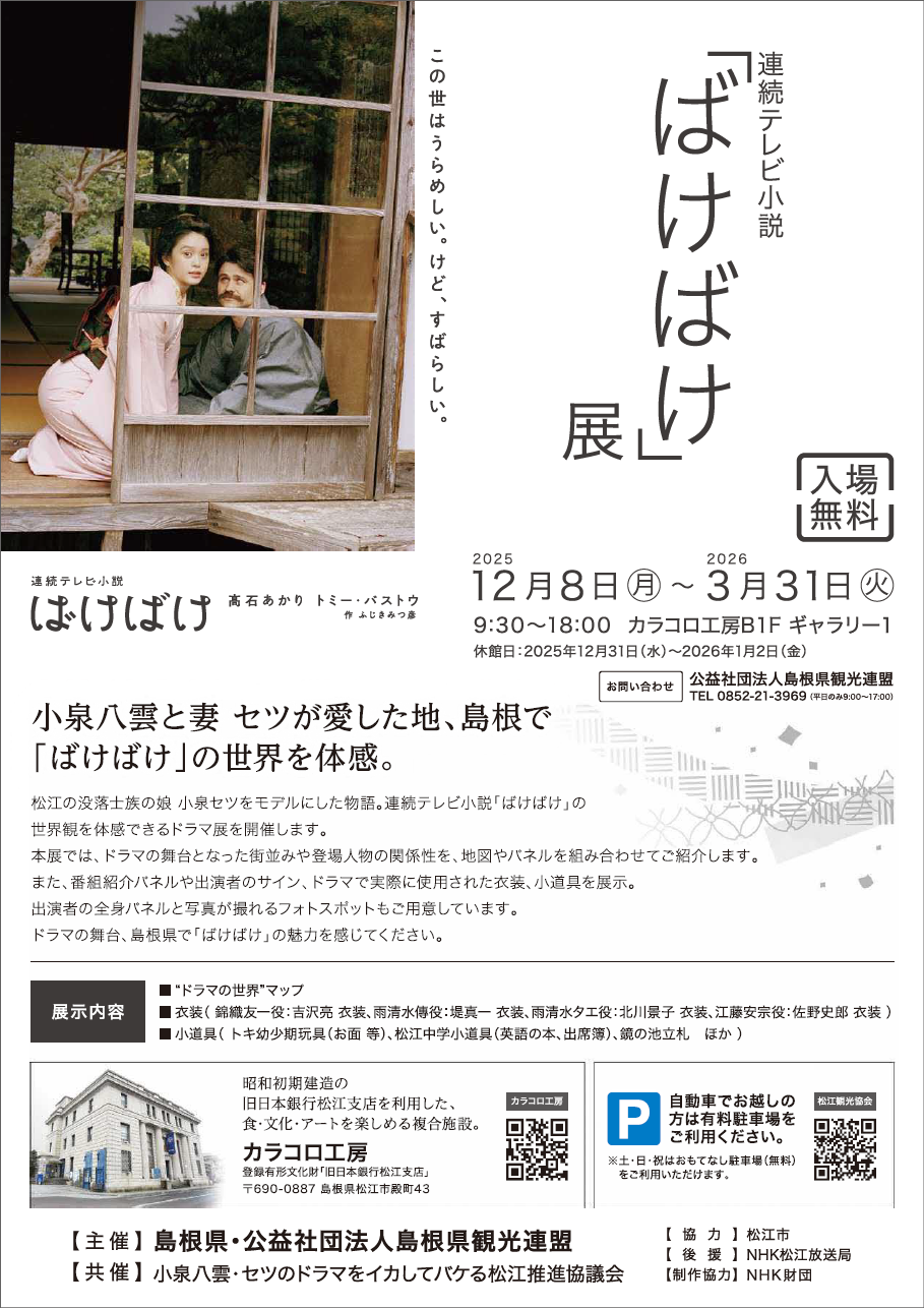 ドラマの舞台、島根県にお越しいただき、「ばけばけ」の世界観を体感していただくとともに、県内各地域を周遊し、島根県の魅力を感じてください。