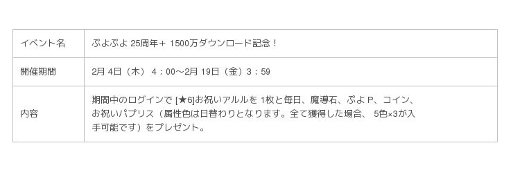 ※ぷよの日記念ステージ 5以降は 2月 8日(月)15:00よりプレイ可能になります