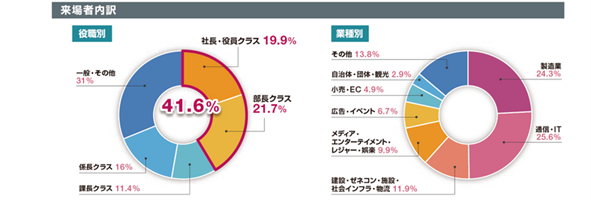 本展には、企業クライアントや、企業の部長クラス以上の役職者、また幅広い業種の担当者が多数来場します。リアルの展示会なので、決裁者に「直接商品・サービスを体験してもらう」ことが可能。「直接商談」できる絶好の機会となっています。