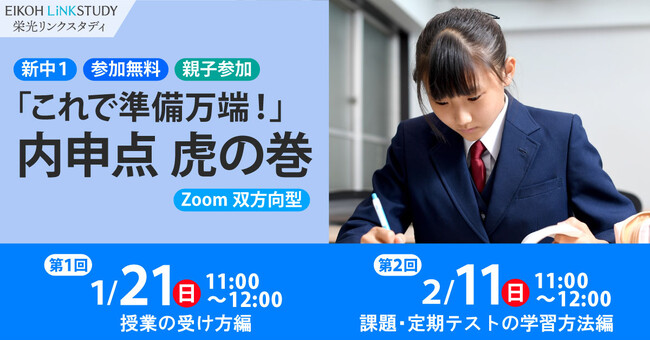 株式会社増進会ホールディングス(Z会グループ)のグループ会社、株式会社栄光(本社:東京都千代田区 代表取締役社長:下田勝昭)が運営するオンライン進学塾「EIKOH LiNKSTUDY(栄光リンクスタディ)」は、高校受験を予定する小学6年生(新中学1年生)と保護者対象のオンライン無料講座「これで準備万端!内申点 虎の巻」を、2024年1月21日(日)・2月11日(日)に開催します。入学前に、中学校でよい成績を取るための秘訣を全2回の講座で伝授します。