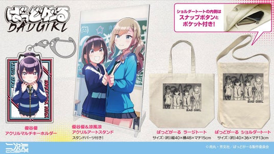 TVアニメも楽しみな『ばっどがーる』より、優と涼をデザインした 「アクリルアートスタンド」をはじめ、 「ショルダートート」など 二次元コスパからラインナップいたします。