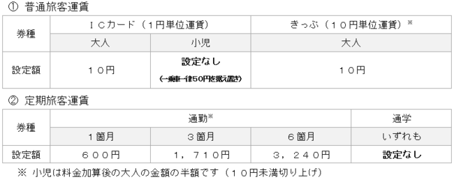 小田急線全線(小田原線・江ノ島線・多摩線)において、旅客運賃に下表記載の料金を加算し、バリアフリー設備の整備費に充当します。なお、小児IC運賃と通学定期旅客運賃は対象外とし、加算はありません。詳細は後日当社ホームページ等でお知らせします。