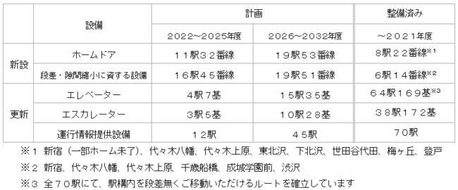 また、2033年度以降の整備計画は、決定次第お知らせします。なお、上記以外にも、各駅の状況や関係自治体との協議を踏まえ、整備を検討してまいります。