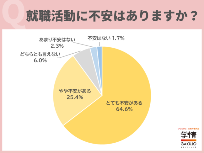 就職活動について、「とても不安がある」と回答した学生が64.6%に上りました。「やや不安がある」25.4%を合わせると、9割に上る学生が就職活動に不安を抱いていることが分かります。「既に内々定を得ている学生もいるので焦りを感じている」「インターンシップに参加した社数が少なかったので、出遅れてしまったと感じる」「やりたい仕事と、適性のある仕事が合致しているか分からない」などの声が上がりました。