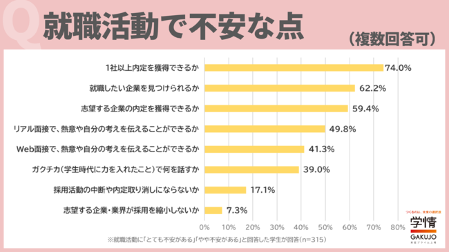 就職活動で不安な点は、「1社以上内定を獲得できるか」が74.0%で最多。次いで、「就職したい企業が見つけられるか」62.2%、「志望する企業の内定を獲得できるか」59.4%が続きます。