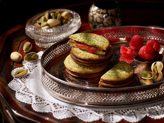 ラズベリーソースをミルクチョコレートでコーティングし、さっくりと焼き上げたピスタチオクッキーでサンドした、今の季節にぴったりのショコラサンドです。