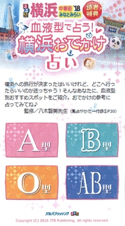 横浜中華街で人気の占い店のひとつ、「鳳占やかた市場通り鑑定所」の八木智美先生監修による「血液型おでかけ占い」を、「るるぶ」で初めて読者特典にします。本誌のQRコードを読みとって特設Webサイトにアクセスすれば、血液型別のオススメ横浜スポットが分かります。行き先に迷った時や、移動中にチェックすれば、旅やおでかけがより一層楽しいものとなります。