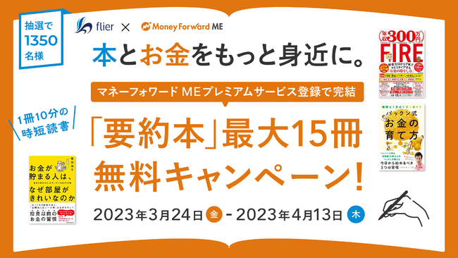 株式会社マネーフォワードは、2023年3月24日(金)より、『マネーフォワード ME』プレミアムサービスを新規でご登録いただいた方を対象に、本の要約サービス「flier(読み方「フライヤー」)」の無料購読チケットが抽選で当たるキャンペーンを開催します。