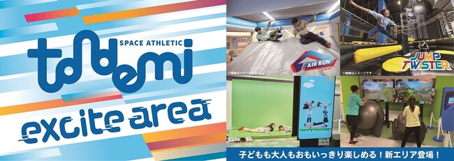 新駅「幕張豊砂駅」の開業により、「トンデミ幕張 イオンモール幕張新都心店」まで駅直結でアクセスできるようになりました。これまで以上に幅広く多くのお客さまに楽しんでもらえるよう、子どもはもちろん大人も思いっきり体を動かして楽しめるエリア『トンデミエキサイトエリア』を新設します。新エリアにはトンデミ初となる「エアーランサーキット」「ジャンプツイスター」など4種の新アクティビティを導入します。