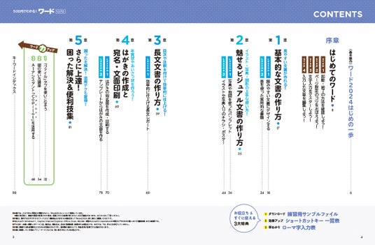 本書は、実際に用いられるビジネス文書やビジュアル文書を模した作例を作成し、その過程で各種機能の使い方や操作方法を学ぶという構成を採用。自然な形で使用頻度の高いテクニックを習得していくことができます。すべての実例でダウンロード可能なサンプルファイルが用意され、誌面を参照しながらワードを操作することで、より確実に身につけることができる点も特徴です。さらに、年賀状シーズンなどで役立つ、住所録を使用したハガキの宛名面の印刷方法なども紹介したほか、よくある困りごととその解決方法をまとめたトラブルシューティングも収録。ワード入門に最適な一冊となっています。