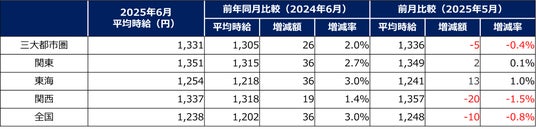 - 三大都市圏、全国平均時給ともに前年同月を上回る。