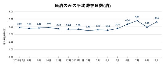 matsuri technologiesの運営する施設に宿泊したゲストの平均の宿泊滞在日数は、7月から9月の平均で4.47泊となっています。特に7月は4.81泊と2024年7月以降、最も高い数字となっています。