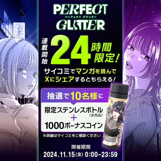2024年11月15日(金)0:00~23:59の24時間限定で、サイコミで『パーフェクト グリッター』を読んでXに感想をシェアすると、抽選で10名様に1.本キャンペーン限定デザインのステンレスボトル2.アプリ内で使える1000ボーナスコインが当たるキャンペーンを開催いたします。