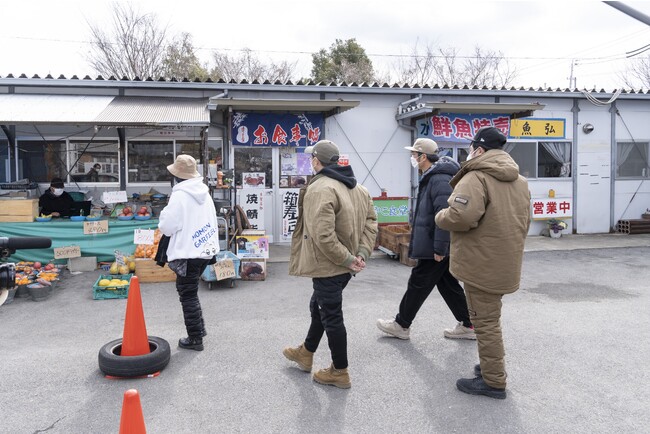 プレゼンキャンパーのアッキーが事前にリサーチしてきた常滑のスポットを巡る今回のツーリングキャンプ。昼食は常滑市民に愛されるプレハブの産直市場『多賀の里』へ。名物のどて煮やサービス満点の巨大なエビフライに、『プライベートで近くを通ったら確実に寄る!』と一同、大満足の様子。