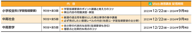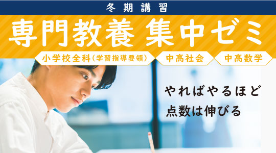 対策に苦慮する方が多い小学校全科の学習指導要領、倍率が高く入念な準備が必要な中高社会、ポイントを押さえた学習が効果的な中高数学という3分野の集中講座をご用意しました。