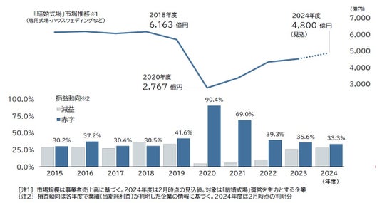 2023年度の国内結婚式場業界では、調査対象企業のうち35.6%が赤字となり、「減益」を含めた「業績悪化」は約6割に上った。2024年度の市場規模は前年度比8%増の4800億円前後と見込まれる。コロナ禍の影響で激減した挙式数は回復しているものの、小規模な披露宴や「ナシ婚」「ジミ婚」の増加、競争激化を背景に、市場規模はコロナ禍前の水準に戻っていない。