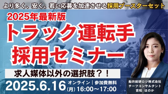 日本最大級の物流コンサルティングファーム 船井総研ロジ株式会社(本社:東京都中央区、代表:橋本直行、以下「船井総研ロジ」)は、2025年6月16日(月)16:00~17:00、 運送会社の経営者・経営幹部の方々を対象にした「第2回 2025年最新版 トラック運転手採用セミナー」をオンラインで開催いたします。