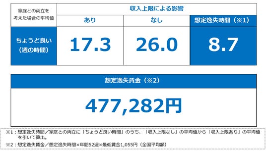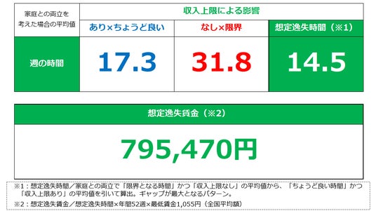 また、家庭との両立を考えた場合に「ちょうど良い」と考える週の労働時間について収入上限の有無で比較したところ「収入上限なし」の方が8.7時間多くなりました。いわゆる年収の壁といった収入上限を意識することで働き控えが生じる分、労働に費やせる時間が失われている可能性があると想定されます。この想定逸失時間に最低賃金の全国平均である1,055円をかけ合わせて想定逸失賃金を算出すると年間477,282円となりました。さらに家庭との両立を考えた場合に「限界」と考える週の労働時間についても同様に比較すると、「収入上限なし」の方が9.3時間多くなりました。また、ギャップが最大になるパターンとして「収入上限あり・ちょうど良い」と「収入上限なし・限界」を比較すると、想定逸失時間は14.5時間、想定逸失賃金は795,470円でした。これらの数字は飽くまで平均値であり、各ご家庭の事情は個々に異なるものの、年収の壁は労働時間や賃金に少なからず影響を与えていると言えそうです。法改正で106万円の壁が撤廃されることが決まり、収入上限なしを選ぶ主婦・主夫層は今後増える可能性があります。物価高が続く中、それが各家庭の手取り増につながっていくことが望まれます。
