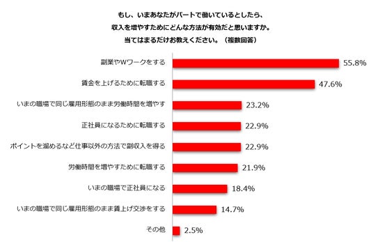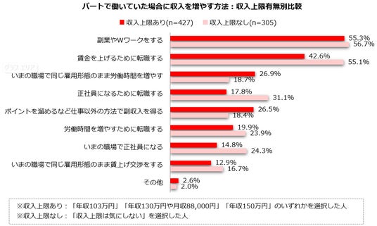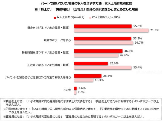 仕事と家庭の両立を希望する主婦・主夫層の96.7%がいまより収入を増やしたいと考えていること、いまパートで働いている場合に収入を増やす有効な方法として「副業やWワーク」が最も多いことなどをお伝えした前回のレポート。収入を増やす方法について再分析し収入上限の有無で比較したところ、ポイントを溜めるなど仕事以外の方法を選んだ比率は「収入上限あり」の方が8.1ポイント高くなりました。一方「転職」については、関連項目をひとまとめにして比較すると「収入上限なし」の方が16ポイントも高くなりました。さらに同じく関連項目をひとまとめにした比較では、「収入上限なし」の方が「賃金を上げる」で16.3ポイント、「正社員になる」では22.8ポイントも高くなりました。収入上限がない方が思い切って別の仕事を探したり、賃上げや正社員への転換といった積極的な活動がしやすいのかもしれません。