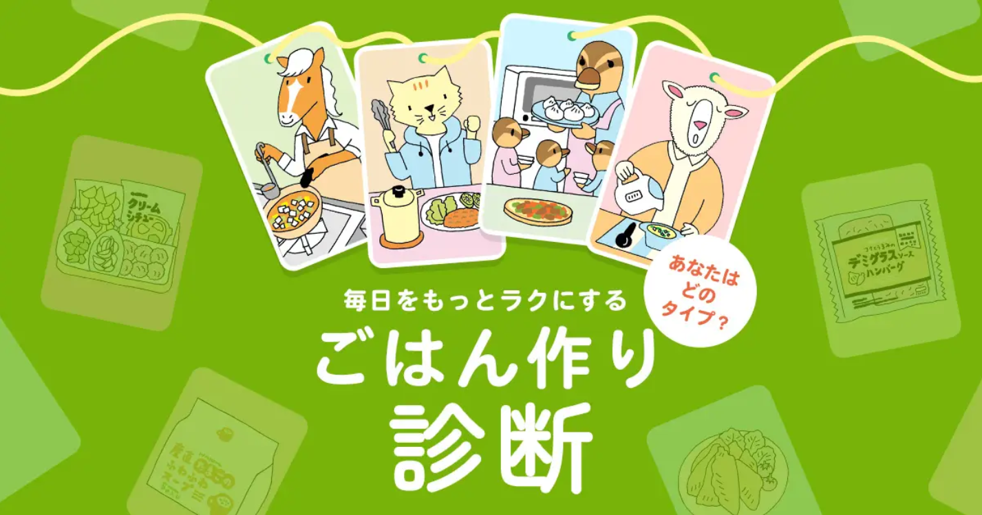 キャンペーンサイトの「ごはんづくり診断」は、10の質問に直感的に回答すると「気配り上手な努力家」「家族思いの働き者」など、回答者が毎日の食事づくりに向き合うモチベーションや時短志向、疲労度でそれぞれのタイプが分かります。ミールキットや温めるだけの冷凍食品など、それぞれのタイプにあわせた調理方法や商品を紹介し、生活スタイルにあわせて程よく手を抜き、心地よく休める献立のヒントを紹介します。